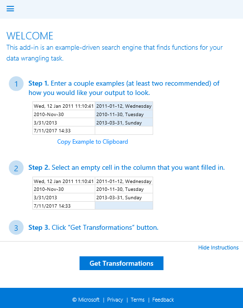 Transform Data by Example Task Pane